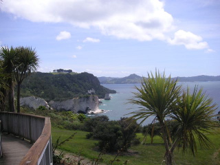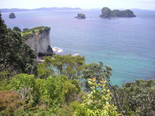 Coromandel半島の東海岸Haheiのビーチの少し手前で「Cathedral Cove」の表示に従って曲がると急な坂道。登りきると最寄りの駐車場があるLook Outポイントに到着します。とても眺めがよく島々が点々と見え、その島々の名前や歴史、Cathedral Coveについての案内があります。Cathedral Coveは手前の岬に隠れてここからは見ることができません。その道のりは徒歩45分と表示されていました。