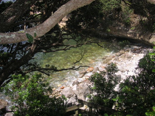 またどんどん下って、最後は急な階段もあり、木の合間にようやく到着地が見えてきました。