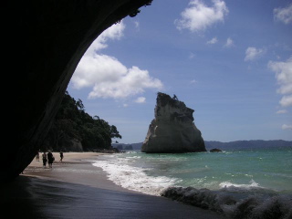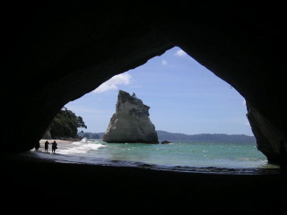 ようやく到着したCathedral Cove。きれいに三角のトンネルができています。中に入ると寒いくらいに涼しい。そして本やテレビなどで何度も見たことのある景色がありました。暗い洞窟の中から見える青い海と白い砂と島は、ひときわ眩しく格別に美しいものでした。
