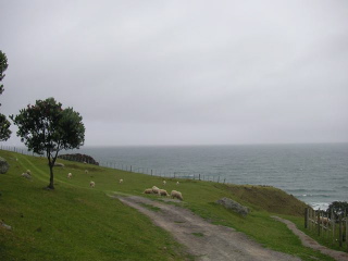 まずはその地名にもなっているMt Maunganuiのウォーキングコースをご紹介します。マウントと呼ばれるこの山は岬の突端にあり、頂上へ登るコースと麓を巡るコースがあります。下から見上げる登頂コースはかなり急なもの。でも少し登っただけで広く白い砂浜が見渡せます。そして羊がいっぱい。あいにくの天候で向こうに広がる海も島も見えず、寒空が広がるばかりだったのが残念でした。