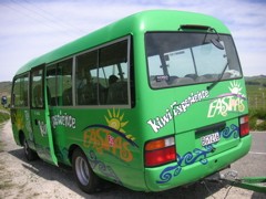 イーストコーストへはKiwi Experienceのミニサイズの緑バスで