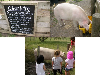 さっそく見えてきたのは豚のCharlotte。人間に慣れていて写真を目の前で撮ってもマイペースにエサを食べています。すっかり慣れた手つきで鼻をなでてあげるお父さん、子供達も興味津々です。