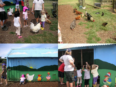 ニワトリ小屋の前ではちょうど餌やりタイムが終わったところでした。子供達がちょこまかしていてもちっとも気に留める様子もなくエサをついばむニワトリたち。子供達は出入り口から小屋を覗き込んだり、部屋の中を見せてもらって話を聞いたり。卵を持っている人がいたので、ちょうどいいタイミングで来るともらえるのかも?