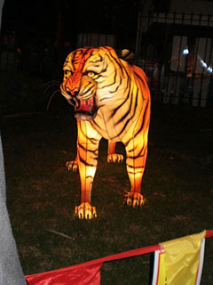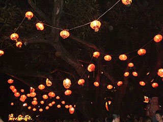 見上げてもランタンがいっぱい木に吊るされてます。野菜のランタンは 白菜、人参?唐辛子?、ひょうたん。たくさんの丸い提灯って感じのラ ンタンが赤くぼんやりきれいでした。最後もゴージャスな門をくぐって 帰路につきました。