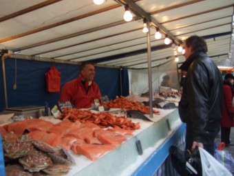魚屋さんでは、大きな殻つきホタテ、サーモン、エビ、舌平目などが並んでいます。いずれも立派で高級そう。
