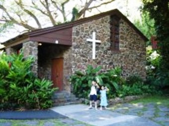 さて、このマノア一角にWai`oli チャペルがあります。まさに森の中にたたずむ小さな素朴な教会です。もともとは孤児院の子供たちのために作られたので、石造りの建物に、ノアの方舟の物語をモチーフにしたステンドグラスがはめ込んであります。