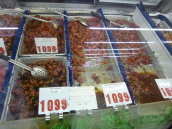 その、新鮮なネタを提供しているのがお隣の鮮魚コーナー、日本で日常目にしているお魚はほとんどここで買うことができます。ここでのオススメは何といってもガラスケースの中で量り売りにされている。POKE(ポキ・ポケ)です。