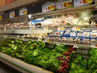 フルーツコーナーの奥には野菜コーナー、いかにものびのびと育った地元の野菜の間に白菜、ホウレンソウ、春菊、大根にミョウガまで並んでいます。そして、いつも感心してしまうのがキノコのコーナー、日本では高くついてしまう大きなマッシュルームや見慣れないキノコが並びます。でも、ここにもきちんとシイタケやエノキタケが置いてあるのがすごいところ。