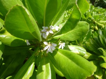 ビーチに行くとよく見かけるのがビーチナウパカ、淡い黄緑色の葉っぱの低木で可憐な小さな花を咲かせます。でもこの花、ちょうど一つの花を半分にしてしまったような形をしています。