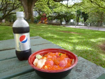 ちょっとミスマッチかもしれませんが、ハワイ王朝の面影にひたりながら青空の下、ペプシとチラシ寿司!これぞハワイでしかできない贅沢だと思っているのです。