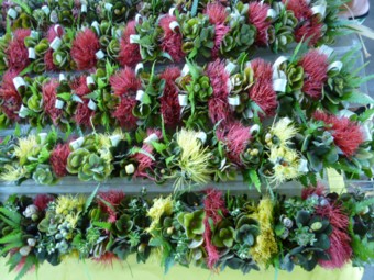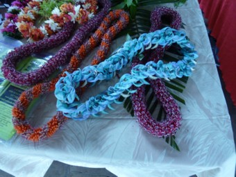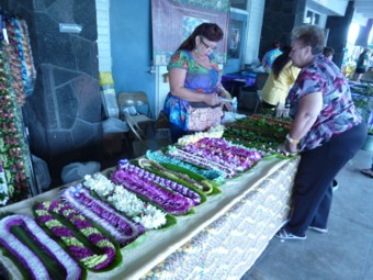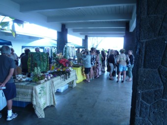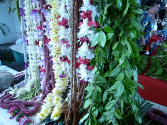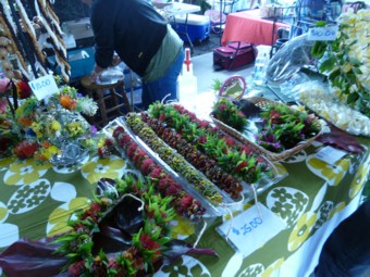そして、クラフトフェアで一段と目を引くのはそれはそれは美しいレイの数々です。夕方から行われるフラの大会はハワイを讃え王様に捧げるお祭りですから出演者にとっても、倍率の高い抽選でチケットを手に入れた観客にとってもまさに最高の舞台、メリーモナークは観客もそれぞれに思考を凝らして、ここ一番のおしゃれをして今晩一晩だけのための生のレイをかけて会場に向かいます。