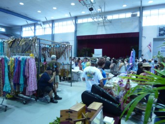 この時期HILOの町では小さなものから一番大きなシビックセンターで行われるクラフトフェアまで大小さまざまなクラフトフェアがハワイ全島から集まった作家たちによって開かれているので、夕方からのフラの大会を前にお買いものをする人だけではなく、このクラフトフェアを目的にHILOにやってくる人も大勢います。ですから、作家や出店業者、HILOの町のショップはここぞとばかりに品物を放出しますし、この時期に新作や新柄を発表するお店も多いので、売る方も買う方もまさに全力真剣勝負です。