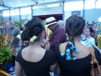 写真の女の子たちは次の日の晩に古典フラに出場する予定の子たち、古典フラ独特の長いふわふわヘアにするために前日から三つ編みをしてクセ付けをしています。これからの大舞台に備えて休憩時間を楽しんでいるようでした。お買い物が楽しいのは誰も一緒ですね。