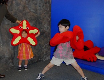 各コーナーがいろいろなものの成り立ちが体験しながらわかるようにできていて、最初のコーナーでは自分自身の成り立ち、つまり体の仕組みがわかるように大きな心臓や胃などの大きな模型が置かれています。