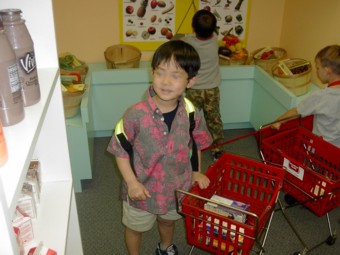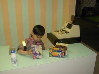 次は自分が住む町の成り立ち、子供たち自身が主体になってわかるように様々な職業の体験コーナー、スーパーマーケットでは、大人さながらにカートを押してお買い物もできるし、レジの店員さんにふんして接客もできます。そのほかにも、消防士になったり、銀行員になったり、自分が住む町の成り立ちが子供たち自身が主体になってわかるように体験して学べるようになっています。