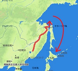 樺太(サハリン)の北端付近でオホーツク海へと流れ込みます。そしてその水はオホーツク海を南下し