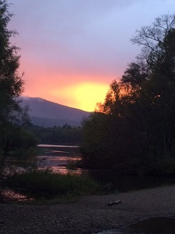 振り返ればビキン川越しにある山の稜線上に燃えるような美しい夕日が落ちていくのが見えます。