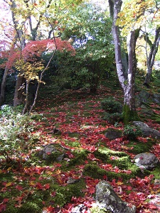 苔むした緑の急斜面に紅葉した葉が散り、ステキなハーモニー。