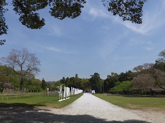 上賀茂神社の一ノ鳥居から二ノ鳥居までの参道両側には広大な芝生が広がっています。