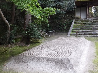 山門を入ると、両側に白い盛り砂があります。水を表わす砂壇の間を通ることは、