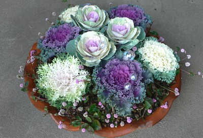 お正月用に大きなコンテナに葉ボタンをたくさん植え、周囲を桃色の金平糖のような花を沢山つけるポリゴナムでかざりました。(ケーキをイメージして作りましょう。)