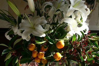 ダイニングはカサブランカと赤実のクロガネモチと福ミカン