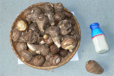 春に植えつけたサトイモ1個がザル1杯になって戻ってきました。