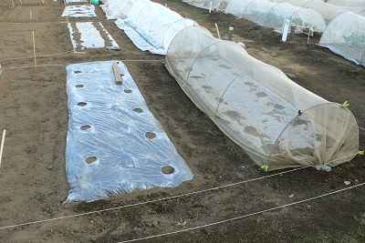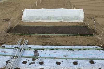 3列目は牡蠣ガラ石灰1カップで良く耕し、マルチ(ビニールシート)で適宜穴が開いているものをしきます。今回は並列の