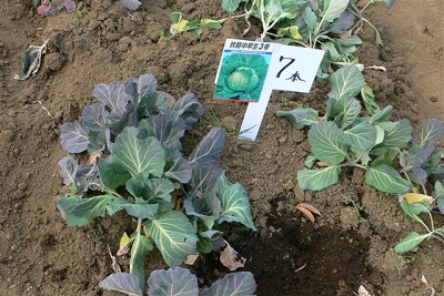 その隣にキャベツの苗を7株植えます。(植穴に水を充分に入れておく)