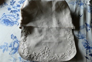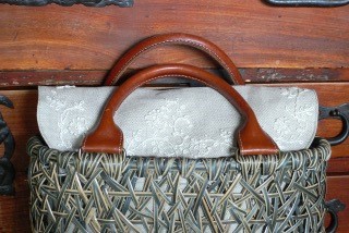 取っ手は古いカバンの再利用で最後に麻の中袋を仕立てて縫い付けました。
