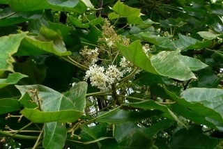 街で見かけるククイナッツのレイ、その実のなる木をポリネシアのエリアで見つけ