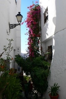 歩き始めると白い壁の途切れた隙間から突然真っ青な海が見えたり、濃いピンクのブーゲン