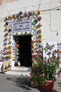 <お土産屋の白い壁を飾るカラフルな陶器>