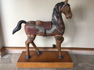 <回廊に飾られた木彫の馬>