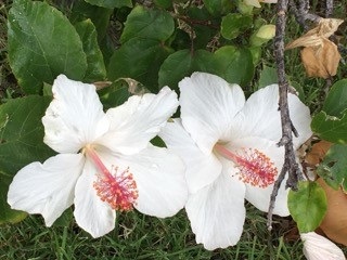 <ハワイの固有種のハイビスカス(コキオ・ケオ・ケオ)>(白い花びらに赤いシベが特徴のハワイの固有種です。)