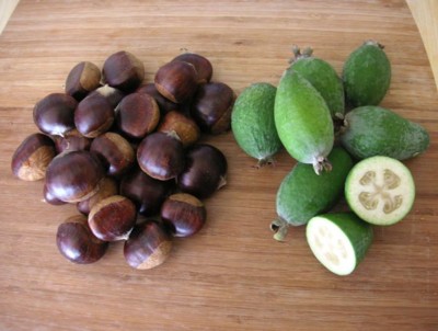 以前にもお届けしたTakapunaの日曜マーケットで、秋の味覚、フィジョアと栗を買いました。フィジョアはこの時期になるとどこにも山積みで売られるフルーツです。透明なゼリーのような部分と白い洋梨のような部分をあわせもつ果肉、味も洋梨に近いような。花のようなさわやかな香りがします。香りが強いため、好き嫌いのわかれるところ。栗はかなり不揃いで甘みも日本の栗ほどではないけれど、やっぱり秋を感じさせてくれます。