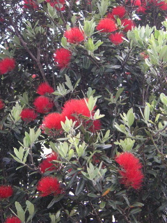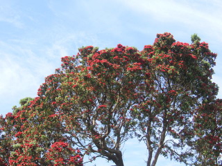 クリスマスの花、Pohutukawaもすっかり満開です。大きな大きな木に満開の真っ赤な花は、真っ青な空に映えて見応えがあります。ここNewZealandでは木を勝手に切ることはできません。そのため、そこここにかなりの巨木が見られ、家より遥かに大きな木が庭にあったりすることも。