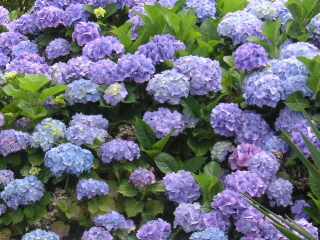 梅雨はありませんが今年は雨が多いためか、きれいに色づいて満開になった紫陽花。大輪の花をつけてあちこちの庭先を彩っています。