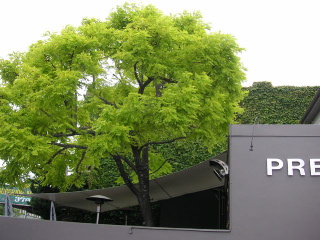 前庭には淡くみずみずしい新緑の木、建物の壁には目を見張るほど鮮やかな赤い花がつたっています。