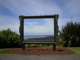 空はまさにAotearoa。ニュージーランドのマオリ語の国名で、細く長くたなびく雲という意味だそうです。昼が近づき、空はどんどん青くなってきました。ビーチが呼んでいるような。Regional Park恒例の額縁で写真を撮って、ビーチへ出発です。