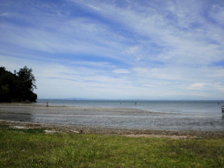 Cornwallisのビーチはすでに人と車でいっぱいで駐車スペースもないので、近くのMills Bayに行ってみました。こちらはうってかわって空いていてのんびり。娘と夫は海へ入りましたが、陸から見ていて豆粒みたいに小さくなっても、娘の肩ほどの深さもない遠浅なビーチ。持参したお弁当を食べたり、貝殻を拾ったり、ゴロゴロしたり、ひとしきりのんびりしてふと気づくと、すっかり水が引いてビーチがなくなっていました。ちょっと変わった形の雲は太陽の光の具合か、ピンクやブルーに染まっていて、いいもの見ちゃった気分。こんなお正月でスタートした今年はきっといい年になるはず?ぜひなってほしいものです。