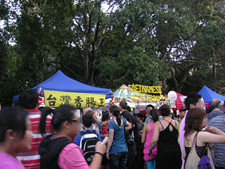 夜はまだ日が長く明るい8時前。ここはアジア?というくらいアジア人でいっぱい。広東・上海・台湾・タイ・ベトナム・マレーシア・・・中国だけでなくアジア各国の屋台、色とりどりで漢字だらけの看板が並んでいます。