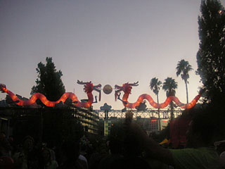 腹ごしらえ完了、ほんのり暗くなってきたのでランタン見物へ移動です。見事な龍のランタンが空に舞っています。地上では龍の舞の準備なのか子供達が駆け抜けていきました。