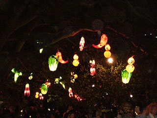 見上げてもランタンがいっぱい木に吊るされてます。野菜のランタンは 白菜、人参?唐辛子?、ひょうたん。たくさんの丸い提灯って感じのラ ンタンが赤くぼんやりきれいでした。最後もゴージャスな門をくぐって 帰路につきました。