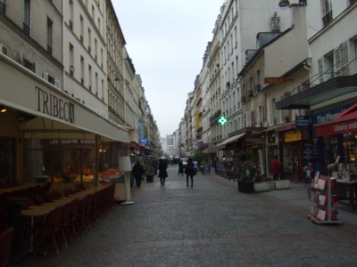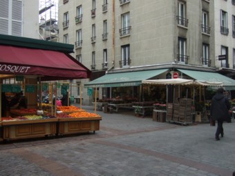 クレア通りには、パリにしては珍しく、広い石畳の遊歩道の両側に、高級食材店やチョコレート店、お花屋さん、カフェやレストランなどの老舗の商店が並んでいます。