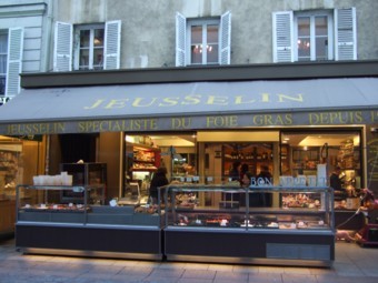 さらに進むと、フォア・グラがスペシャルと書かれたJeusselin というバスク料理をベースにしたデリカテッセンが。おいしそうなハムやサラミ、パテ、サラダなどご馳走が並んでいます。