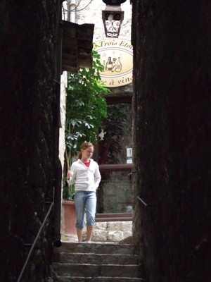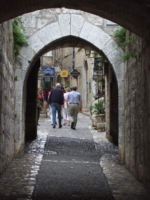 街の城壁や展望広場からは、南仏特有のパノラマを楽しむことができます。南側は、ゆるやかに下る緑の谷間から地中海が顔をだし、北側は、南仏特有の白茶けた岩肌の山間から雪を頂いたヨーロッパアルプスを望むことができます。この街がピトレスクな(絵のように美しい)のは、外から街を眺めるだけでなく、街の内側からの眺望もさすのでしょう。