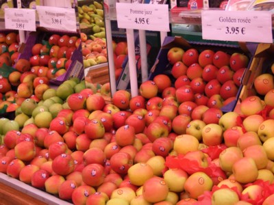 まずは、目にもおいしいカラフルなフルーツショップ。種類の多いりんごも出揃っています。ここではゴールデン、レイネットなど4種類がでています。お値段はキロ4ユーロ程。