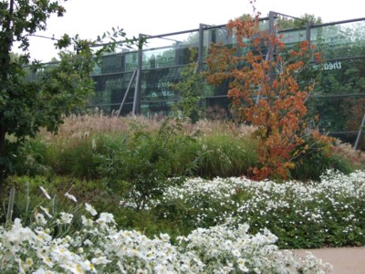 さて、膨大な展示を堪能した後は、庭園に出てみましょう。 紅葉を始めた木々、ススキが生い茂り、白や黄色の秋の草花が咲き誇る野原のよう。