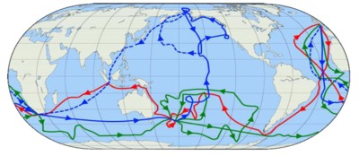 <ジェームズ.クックの3回の探索航路 (赤-1回目航海.緑-2回目航海.青-3回目航海)Jon Platek作成> |